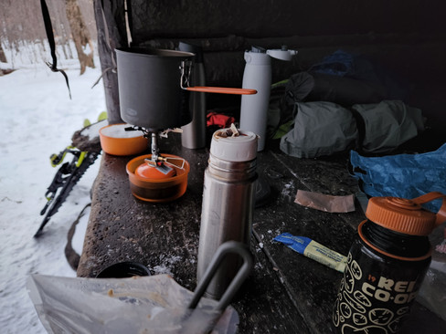 Stove: Traditional cold-weather camping doctrine calls for a white gas stove. This is because canister stoves (isobutane) often lose the pressure needed to run properly in very cold temperatures. I learned that placing the canister in a water bath helps keep the pressure high enough to work normally. So far, this strategy has allowed me to use my simple canister stove (Soto WindMaster) down to -2 degrees with no issues.